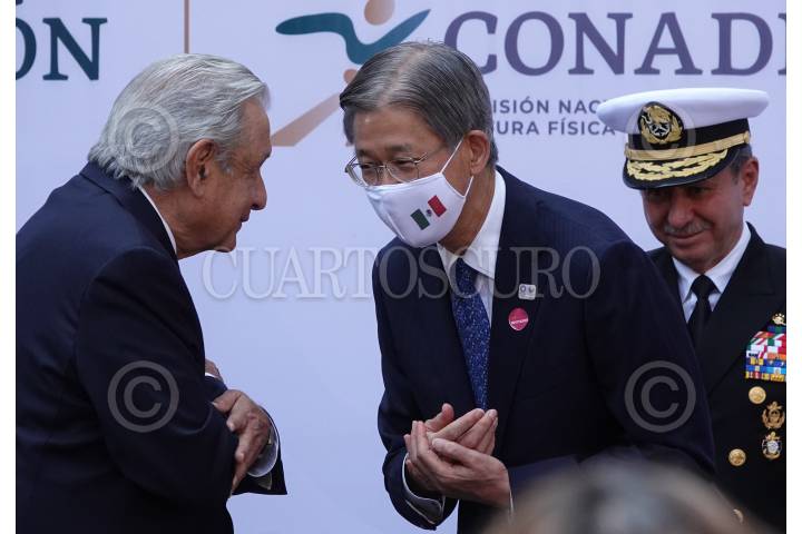 Andrés Manuel López Obrador y Yusushi Takashe, embajador de Japón en México, durante el abanderamiento de la Delegación Mexicana que participara en los Juegos Paralímpicos de Tokio 2020