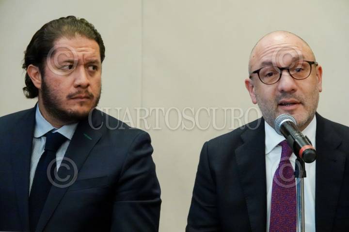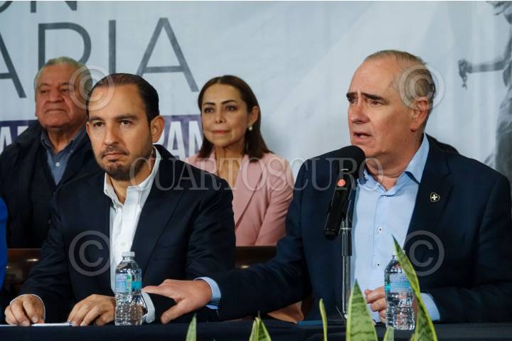 CIUDAD DE MÉXICO, 06FEBRERO2024.- Marko Cortés, presidente nacional de Partido Acción Nacional (PAN), y Julen Rementería, coordinador del PAN en el Senado, durante la conferencia de prensa para dar su posicionamiento tras la Reunión Plenaria del partido, así como las acciones a tomar tras la presentación de las nuevas reformas constitucionales del presidente Andrés Manuel López Obrador. En la conferencia también estuvieron la senadora Alejandra Reynoso; la candidata a senadora por Sonora, Lilly Téllez; Kenya López Rabadan, jefa de oficina de la candidata Xóchitl Gálvez, y la senadora Josefina Vázquez Mota. FOTO: GALO CAÑAS/CUARTOSCURO.COM