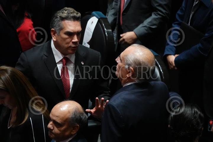 El presidente del Senado, Armando Armenta, conversa con Julen Rementería, coordinador de los panistas, durante la toma de la tribuna por parte de los parlamentarios blanquiazules para exigir la designación de los integrantes del INAI.