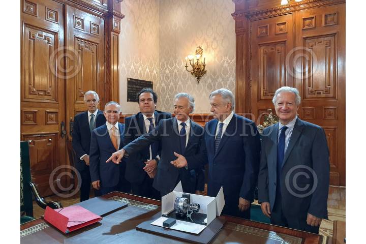 CIUDAD DE MÉXICO, 28MAYO2019.- Andrés Manuel López Obrador, Presidente de México, se reunió en su oficina de Palacio Nacional con directivos del Grupo Safran que es una multinacional francesa de alta tecnología, especializada en el sector aeronáutico y seguridad. En la imagen Julián Ventura, subsecretario de Relaciones Exteriores, Alfonso Romo Garza, jefe de la Oficina de Presidencia, Edgar García, Andrés Manuel López Obrador, Presidente de México, Phillippe Petitcolin y Daniel Parfait. FOTO: PRESIDENCIA /CUARTOSCURO.COM