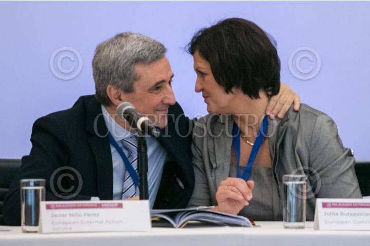 Javier Niño Pérez, funcionario del Servicio Europeo de Acción Exterior, y Jolita Butkeviciene, directora para América Latina en la Comisión Europea, durante el diálogo en la SRE.
