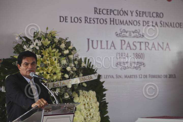 SINALOA DE LEYVA, SINALOA, 12FEBRERO2013.- El gobernador Mario Lopez Valdez, la artista visual Laura Anderson Barbata y la directora de instituto sinaloense de cultura Maria Luisa Miranda encabezaron el evento donde los restos de Julia Pastrana Mejor conocida como la mujer mono fueron enterrados en el panteón municipal, después de de una misa donde se le rindió homenaje a dicha artista Sinaloense. FOTO: RASHIDE FRIAS /CUARTOSCURO.COM