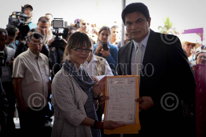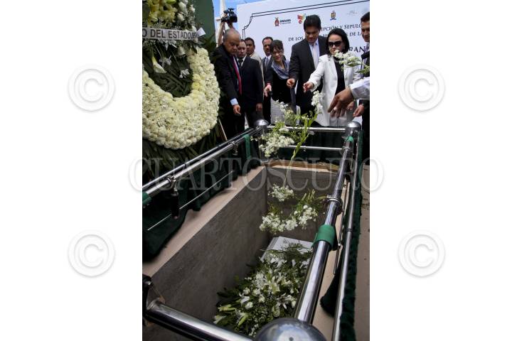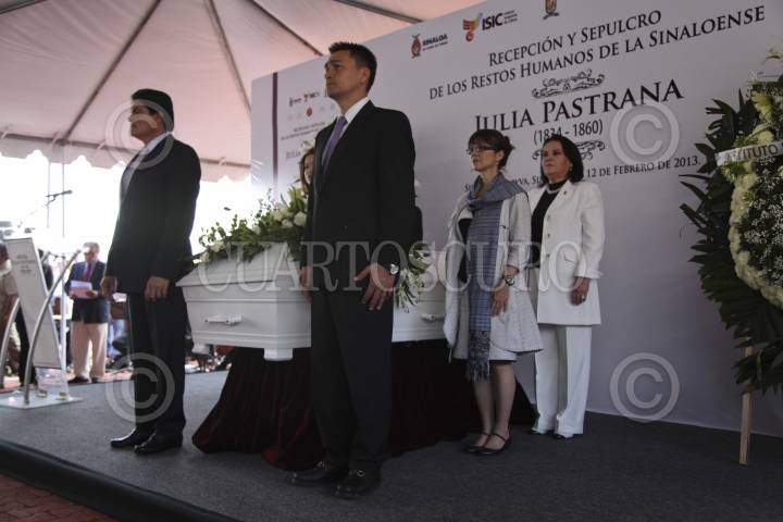 SINALOA DE LEYVA, SINALOA, 12FEBRERO2013.- El gobernador Mario López Valdez, la artista visual Laura Anderson Barbata y la directora de instituto sinaloense de cultura Maria Luisa Miranda encabezaron el evento donde los restos de Julia Pastrana Mejor conocida como la mujer mono fueron enterrados en el panteón municipal, después de de una misa donde se le rindió homenaje a dicha artista Sinaloense. FOTO: RASHIDE FRIAS /CUARTOSCURO.COM