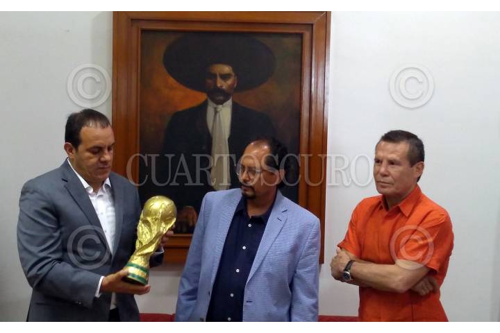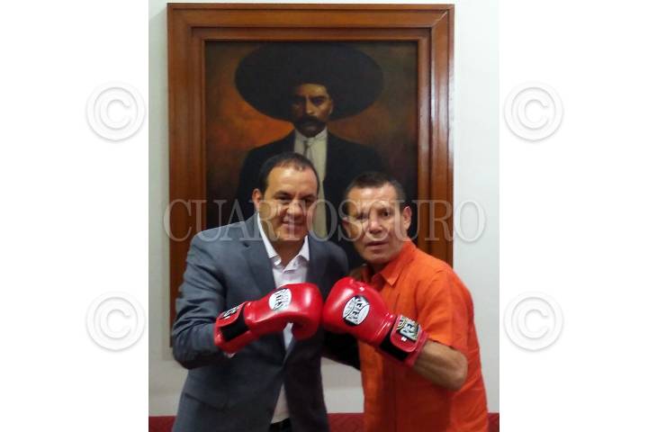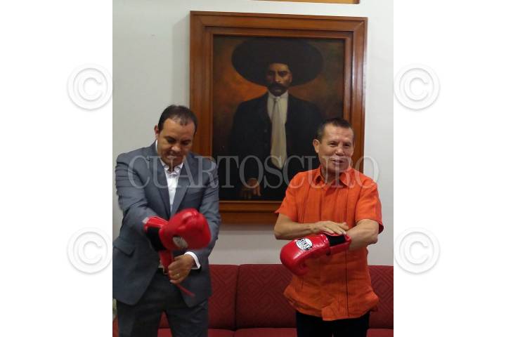 CUERNAVACA, MORELOS, 06SEPTIEMBRE2019.- El boxeador Julio César Chávez obsequio al gobernador Cuauhtémoc Blanco Bravo, un juego de guantes que serán subastados a beneficio del DIF Morelos. También recibió de Mariano Fragoso un replica de la copa mundial con las fechas de los mundiales donde participo el mandatario estatal. FOTO: ESPECIAL /CUARTOSCURO.COM