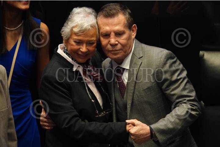 La senadora Olga Sánchez Cordero y el boxeador mundial Julio César Chávez se tomaron una foto al término de la entrega del reconocimiento por su trayectoria en el pleno del Senado de la República