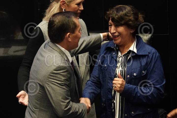 El boxeador mundial Julio César Chávez y Delfina Gómez se saludaron durante la entrega del reconocimiento por su trayectoria en el pleno del Senado de la República