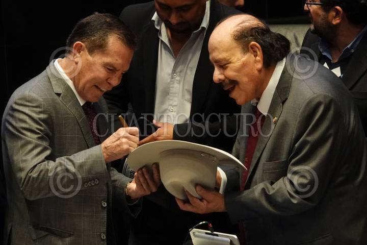 El boxeador mundial Julio César Chávez firmó el sombrero del senador Armando Guadiana durante la entrega del reconocimiento por su trayectoria en el pleno del Senado de la República