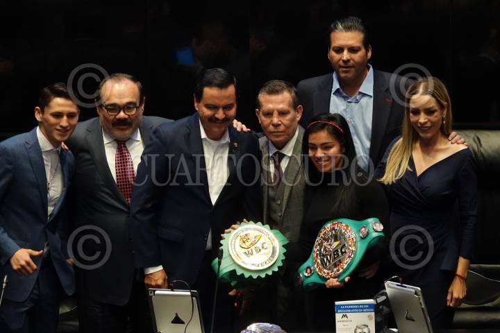 Los boxeadores mundiales Julio César Chávez y Jaqueline Calvo Ramírez acompañados de los senadores del PRI durante la entrega del reconocimiento por su trayectoria en el pleno del Senado de la República