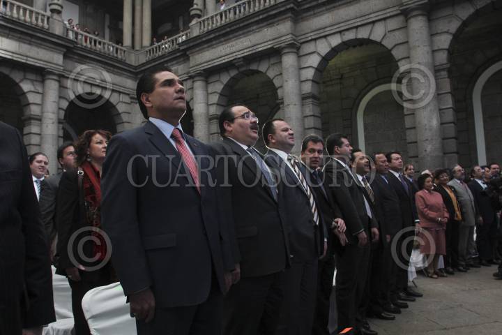MÉXICO, D.F., 07NOVIEMBRE2012.- Silvano Aureoles Conejo, coordinador de los diputados federales del PRD, Jorge Carlos Ramírez Marín, vicecoordinador de la estrategia de seguridad en el equipo de transición del equipo de Enrique Peña Nieto, Jesús Rodríguez Almeida, Procurador General de Justicia del DF, y Julio César Serna, integrante del equipo de Mancera, durante la presentación del proyecto “Rumbo a la Reforma Política del Distrito Federal” presentado por Miguel Ángel Mancera, Jefe de Gobierno electo, en Palacio de Minería. FOTO: SAÚL LÓPEZ /CUARTOSCURO.COM