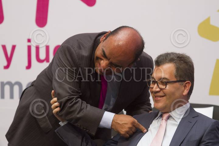 MÉXICO, D.F., 12JUNIO2015.- Juan Ayala, líder del Sindicato de Trabajadores del Distrito Federal y Julio César Serna, administrador general de la Central de Abasto de la Ciudad de México, durante un evento en donde se conmemoro el Día Mundial contra el Trabajo Infantil, en el Antiguo Palacio del Ayuntamiento. FOTO: MOISÉS PABLO /CUARTOSCURO.COM