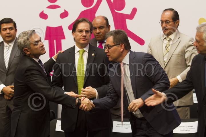 MÉXICO, D.F., 12JUNIO2015.- Miguel Ángel Mancera, Jefe de Gobierno, Salomón Chertorivski, Secretaría de Desarrollo Económico, Julio César Serna, administrador general de la Central de Abasto de la Ciudad de México y Miguel Torruco, secretario de Turismo del DF, durante un evento en donde se conmemoro el Día Mundial contra el Trabajo Infantil, en el Antiguo Palacio del Ayuntamiento. FOTO: MOISÉS PABLO /CUARTOSCURO.COM