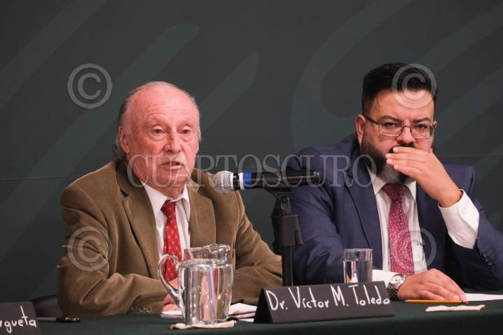 CIUDA DE MÉXICO, 16JULIO2019.- Víctor Toledo, titular de la Secretaria de Medio Ambiente y Recursos Naturales (SEMARNAT) y Julio Trujillo, subsecretario de Fomento y Normatividad Ambiental, durante la conferencia de prensa en la que informaron sobre la declaratoria de Restauración Ecológica de la presa Endhó, en Tula Hidalgo y la evaluación de daños ambientales por el derrame de tres mil litros de ácido sulfúrico en el Mar de Cortés, en Sonora. FOTO: GRACIELA LÓPEZ /CUARTOSCURO.COM