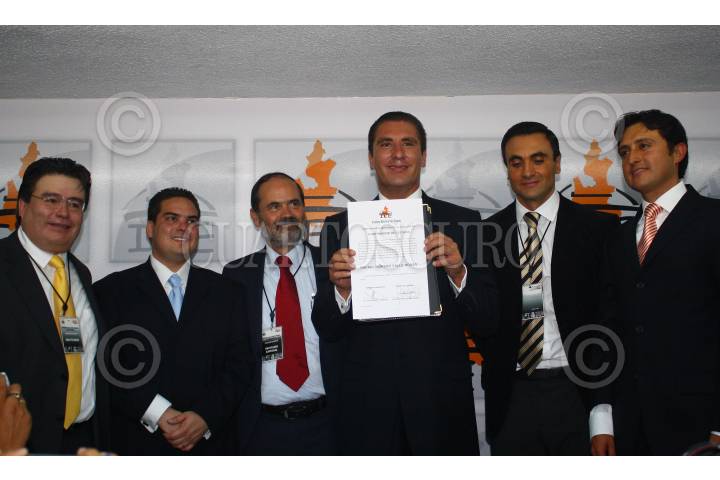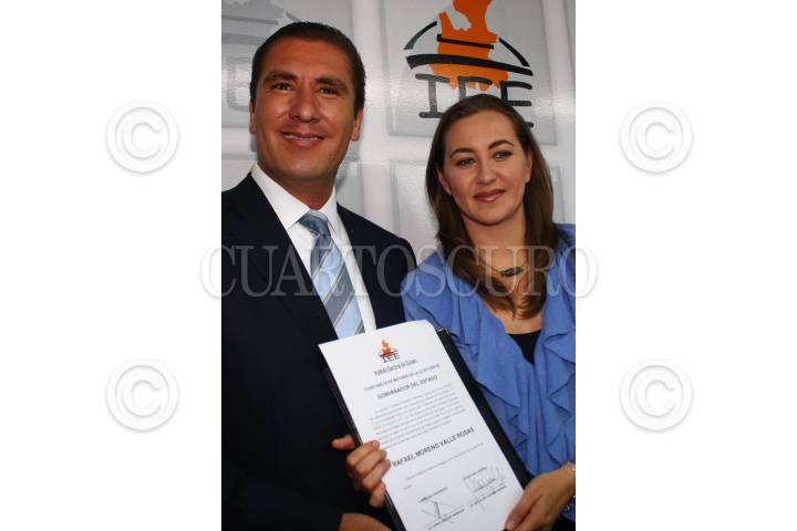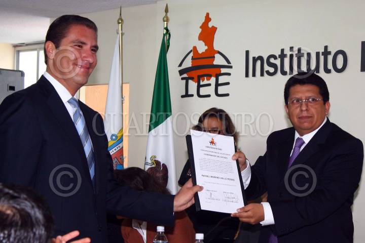 PUEBLA, PUEBLA 11JULIO2010.- Rafael Moreno Valle, candidato a gobernador electo, por la coalición "Compromiso por Puebla", recibió de manos del consejero presidente del IEE, Jorge Sánchez Morales, la constancia de mayoría de votos que acredita a Moreno Valle Rosas, como el ganador de la contienda electoral del pasado 4 de julio. FOTO: FRANCISCO GUASCO/CUARTOSCURO.COM