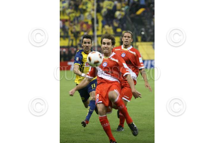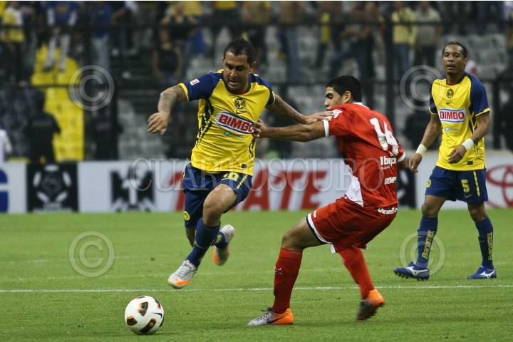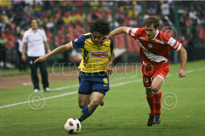 MÉXICO, D.F., 06ABRIL2011.- Daniel Montenegro, del América, pelea el balón con Matias Laba, de Argentino Jr., en el partido de la Copa Libertadores, disputado en el estadio Azteca, el cual se encuentra empatado a cero tantos al medio tiempo. FOTO: ISAAC ESQUIVEL/CUARTOSCURO.COM