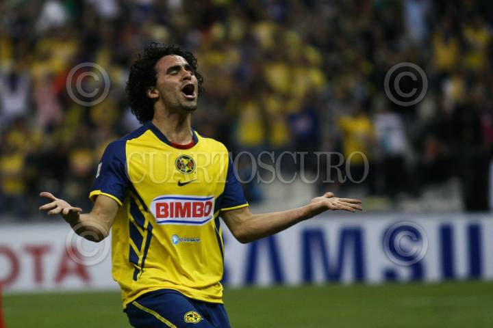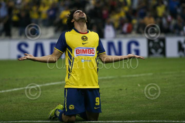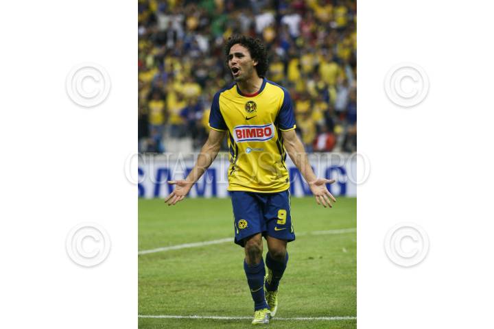 MÉXICO, D.F., 06ABRIL2011.- Enrique Esqueda, del América, se lamenta luego de que fue anulado un tanto que anotó con la cabeza en el partido de la Copa Libertadores, disputado en el estadio Azteca, el cual se encuentra empatado a cero tantos al medio tiempo. FOTO: ISAAC ESQUIVEL/CUARTOSCURO.COM