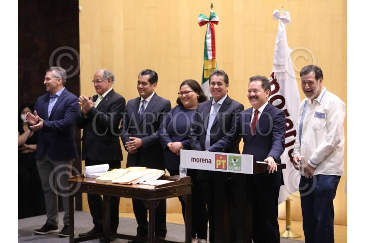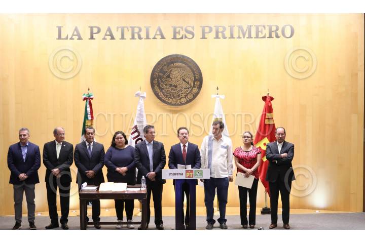 Manuel Rodríguez, presidente de Energía; Ramiro Robledo, presidente de la Comisión de Puntos Constitucionales; Sergio Gutierrez, presidente de la mesa directiva; Citlalli Hernandez Mora, secretaria general de Morena; Carlos Puente Salas, coordinador del PVEM; Ignacio Mier, coordinador de Morena; Gerardo Fernández Noroña, diputado del PT , y los diputados de Morena: Aleyda Alavez y Leonel Godoy, encabezaron la presentación de las propuestas del proyecto de dictamen de la reforma Eléctrica la coalición Juntos Hacemos Historia, e indicaron la aceptación de 9 de los 12 puntos de la iniciativa de la oposición "Va por México".