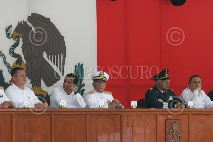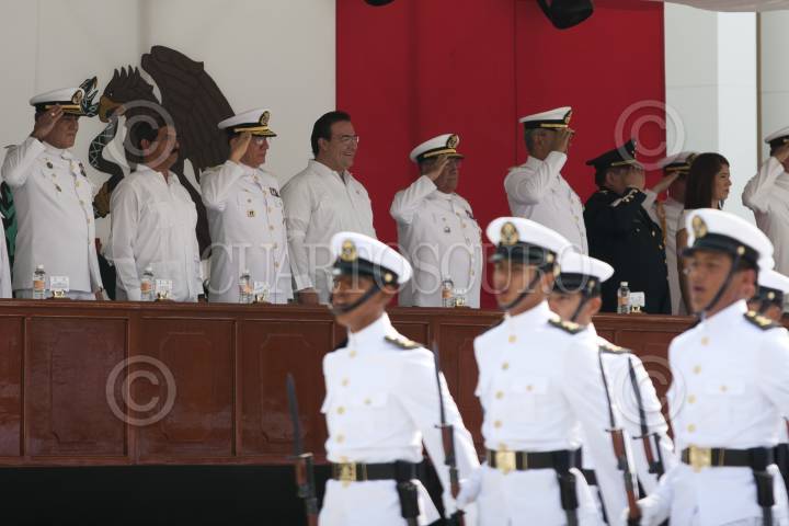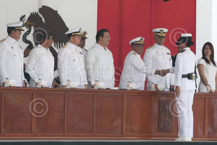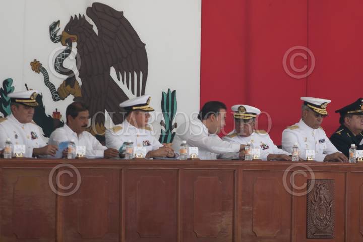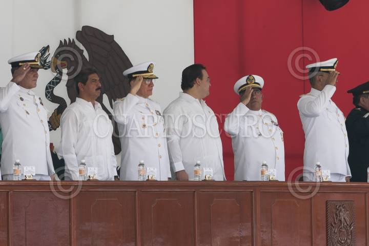 ANTÓN LIZARDO, VERACRUZ., 21ABRIL2011.- Francisco Zaynez Mendoza, Secretario de Marina acompañado de Javier Duarte, Gobernador de Veracruz, encabezo la ceremonia en la que 252 cadetes del 1er. Año realizaron la tradicional Jura de Bandera en las instalaciones de la Heroica Escuela Naval Militar. FOTO: GUILLERMO PEREA/CUARTOSCURO.COM