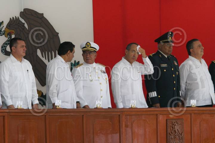 ANTÓN LIZARDO, VERACRUZ; 21ABRIL2010.- Felipe Calderón Hinojosa Presidente de México, acompañado de Genaro García Luna, Secretario de Seguridad, Fidel Herrera Beltrán, Gobernador de esta entidad, Francisco Zaynes Mendoza, Secretario de la Amada de México, Guillermo Galván Galván, Secretario de la Defensa Nacional y de Fernando Gómez Mont, titular de Gobernación, encabezo la ceremonia conmemorativa del 96 Aniversario de la Defensa del Puerto de Veracruz y la Jura de Bandera de los cadetes de la Heroica Escuela Naval Militar. FOTO: GUILLERMO PEREA /CUARTOSCURO.COM