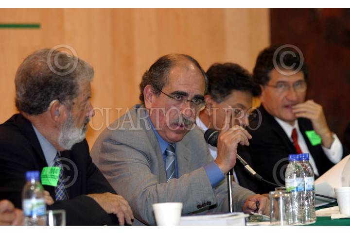 México, D.F 20 JULIO 2004.- Nestor De Buen, abogado, Pablo Gómez, coordinador de la bancada perredista en la cámara de diputados, Miguel Alfonso Raya, Arturo Alcalde Justiniani, abogado en el Foro de analisis de la reforma a la ley del seguro social en contexto laboral. FOTO: Sandra Perdomo/CUARTOSCURO.COM