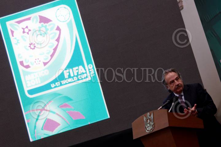 MÉXICO, D.F., 03MARZO2011.- Alejandro Rojas Diaz Duran, secretario de Turismo y Justino Compean, director de la Federación Mexicana de Fútbol durante la presentación del logotipo de la Copa Mundial Sub 17, Sede Ciudad de México que se realizo en el patio del Antiguo Palacio de Ayuntamiento. FOTO: RODOLFO ANGULO/CUARTOSCURO.COM