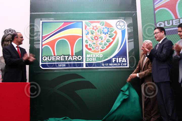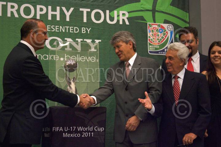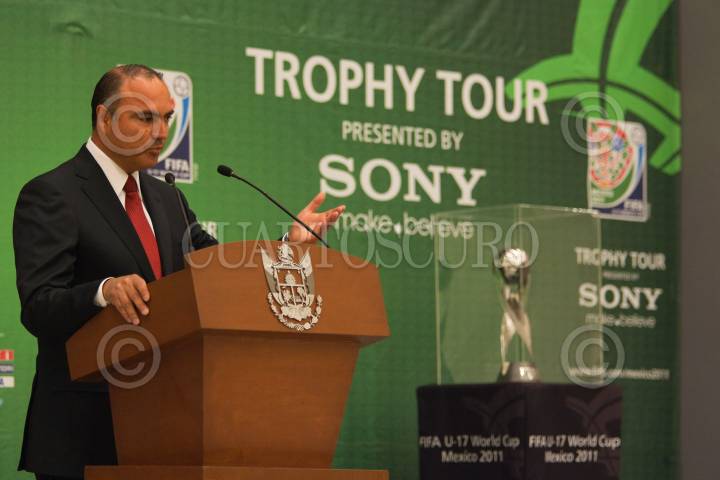 QUERÉTARO, QUERÉTARO, 12ABRIL2011.- El gobernador del estado José Calzada encabezó el acto protocolario de la presentación de la copa del Mundial de Fútbol Sub 17. En la presentación estuvo el técnico mexicano Jesús "Chucho" Ramírez, campeón del mundo en esta categoría, y Justino Compeán, presidente del Comité Organizador del Mundial Fútbol Sub 17 y Yon De Luisa, director del Comité Organizador del Mundial de Fútbol Sub 17. FOTO: DEMIAN CHÁVEZ/CUARTOSCURO.COM