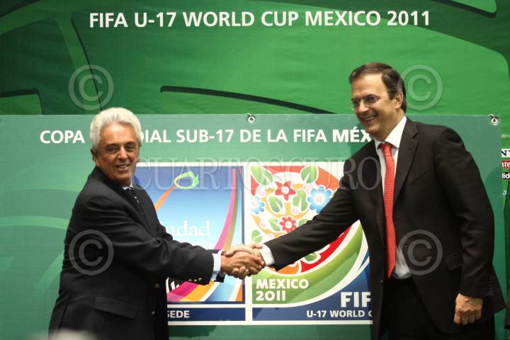 MÉXICO, D.F., 03MARZO2011.- Justino Compean, director de la Federación Mexicana de Futbol y Marcelo Ebrard, jefe de gobierno del Distrito Federal durante la presentación del logotipo de la Copa Mundial Sub 17, Sede Ciudad de México que se realizo en el patio del Antiguo Palacio de Ayuntamiento. FOTO: RODOLFO ANGULO/CUARTOSCURO.COM