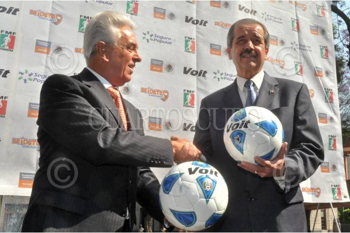 MÉXICO, D.F., 23MARZO2011.- Justino Compeán, presidente de la Federación Mexicana de Fútbol (Femexfut) y José Ángel Cordova Villalobos, secretario de Salud, durante la presentación de la campaña "Balón contra la obesidad". Ésto, para promover el ejercicio y que se jugará las jornadas 12 a 15 del Torneo de Clausura 2011 de la primera división del fútbol mexicano. FOTO: EDUARDO MORALES/CUARTOSCURO.COM
