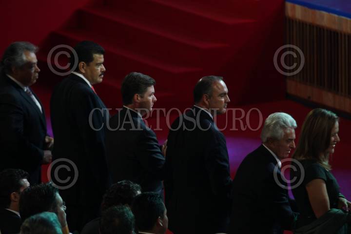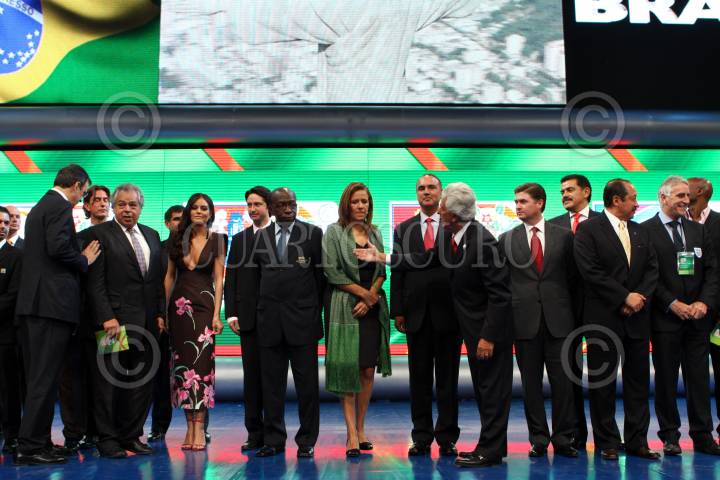 MÉXICO, D.F., 17MAYO2011.- Ximena Navarrete, Miss Universo; Yon de Luisa, presidente del Comite Organizador Local; Jack Warner, Vicepresidente de la FIFA; Margarita Zavala, esposa del presidente Felipe Calderón; Justino Compean, presidente de la Femexfut; José Calzada Rovirosa, gobernador del estado de Queretaro; Rodrigo Medina, gobernador del estado de Nuevo León; José Francisco Olvera Ruiz, gobernador del estado de Hidalgo y Leonel Godoy, gobernador del estado de Michoacan al termino del Sorteo Oficial de la Copa Mundial de la FIFA Sub 17, que se realizo en la Sala Nezahualcóyotl de Ciudad Universitaria. FOTO: RODOLFO ANGULO/CUARTOSCURO.COM