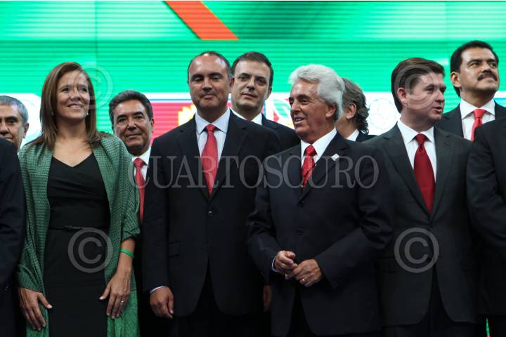 MÉXICO, D.F., 17MAYO2011.- José Francisco Olvera Ruiz, gobernador del estado de Hidalgo; Rodrigo Medina, gobernador del estado de Nuevo León; José Calzada Rovirosa, gobernador del estado de Queretaro; Justino Compean, presidente de la Femexfut y Margarita Zavala, esposa del presidente Felipe Calderón durante el Sorteo Oficial de la Copa Mundial de la FIFA Sub 17, que se realizo en la Sala Nezahualcóyotl de Ciudad Universitaria. FOTO: RODOLFO ANGULO/CUARTOSCURO.COM