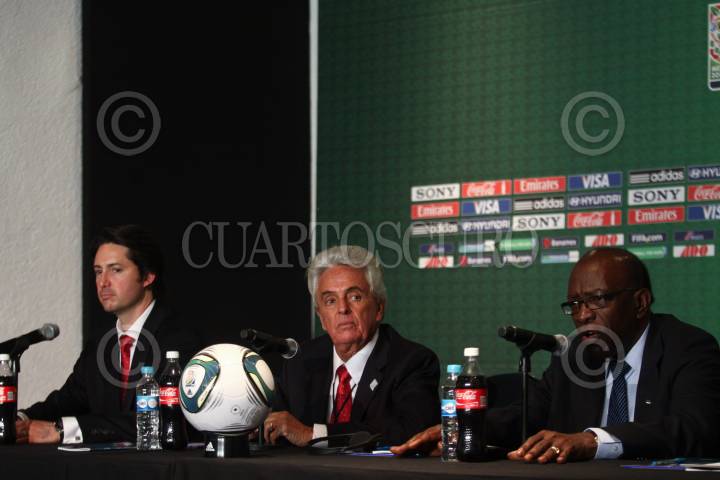 MÉXICO, D.F., 17MAYO2011.- Yon de Luisa, presidente del Comite Organizador Local; Justino Compean, presidente de la Femexfut; Jack Warner, Vicepresidente de la FIFA; durante una conferencia de prensa al termino del Sorteo Oficial de la Copa Mundial de la FIFA Sub 17, que se realizo en la Sala Nezahualcóyotl de Ciudad Universitaria. FOTO: RODOLFO ANGULO/CUARTOSCURO.COM