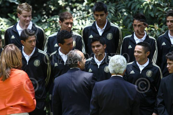 MÉXICO, D.F., 09JUNIO2011.- El presidente Felipe Calderón acompañado de su esposa Margarita Zavala, Justino Compean, presidente de la Federación Mexicana de Fútbol y Bernardo de la Garza, titular de la Conade al termino del evento del abanderamiento de las Selecciones Nacional de Fútbol Sub 17, Femenil Mayor y de Playa que se realizo en la residencia oficial de Los Pinos. FOTO: RODOLFO ANGULO/CUARTOSCURO.COM