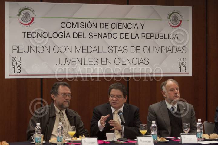 MÉXICO, D.F., 13DICIEMBRE2011.- Carlos Mauricio Castro Acuña, Francisco Castellón Fonseca, presidente de la comisión de Ciencia y Tecnología del Senado, y Arturo Mechaca Rocha, director de la Academia Mexicana de Ciencias, se reunieron con los medallistas de olimpiadas juveniles en ciencias. FOTO: MOISÉS PABLO/CUARTOSCURO.COM