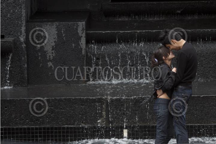MÉXICO, D.F., 18FEBRERO2012.- Un par de novios adolescentes se acarician en una fuente para mitigar los calores de la edad. FOTO: MOISÉS PABLO /CUARTOSCURO.COM