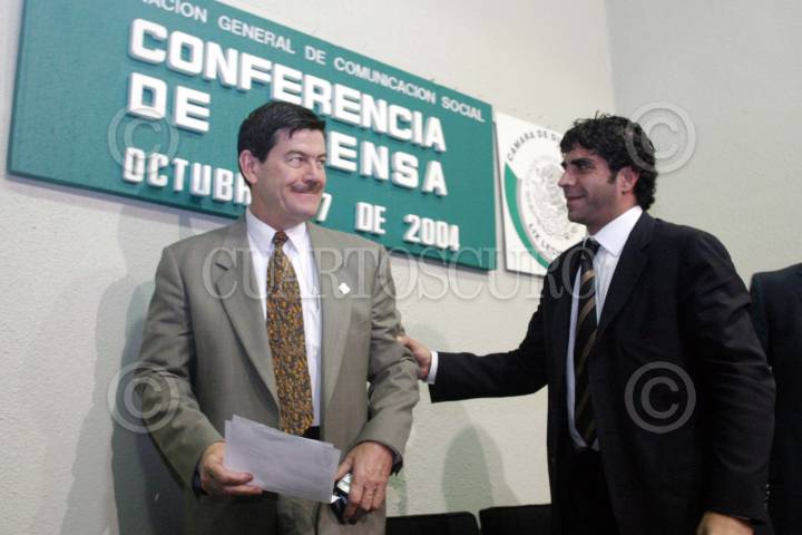 Mèxico, D.F., 07OCTUBRE2004.-Los coordinadores de las fracciones del PAN y PMVE; Francisco Barrio y Jorge Kahwagi, respectivamente, ofrecieron una conferencia de prensa para señalar su postura después de la toma de la mesa directiva por parte de los diputados perredistas. FOTO: Moisés Pablo/CUARTOSCURO.COM