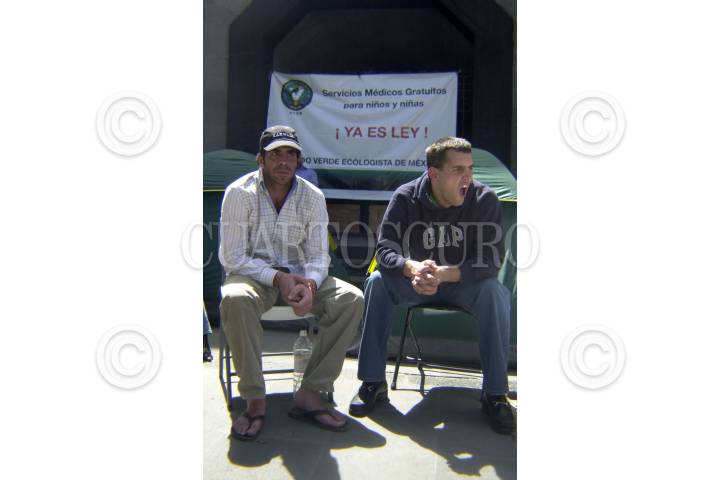 MEXICO, D.F. 07MARZO2005.- Jorge Kahwagi, militante del PVEM, y Jorge Emilio González Martínez, presidente nacional del PVEM, premanecen en plantó frente a las instalaciones de la Secretaría de Salud, hasta que se cumpla la ley de servicios médicos educativos para niños y niñas. FOTO: Iván Stephens/CUARTOSCURO.COM