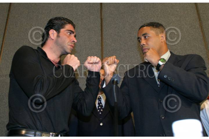 MEXICO, D.F. 30JUNIO2005.- Los boxeadores Jorge Kahwagi y Roberto Coelho al termino de la conferencia de prensa que ofrecieron a los medios de comunicación con motivo de su proximo encuentro. FOTO: Nelly Salas/CUARTOSCURO.COM