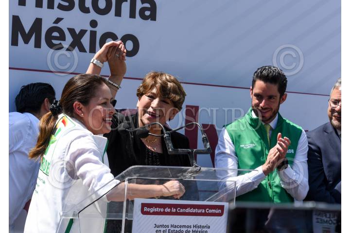 Karen Castrejón líder nacional del PVEM y la gobernadora de Quintana Roo María Elena Lezama acudieron al registro de Delfina Gómez como candidata para la gubernatura del periodo 2023-2029 por la coalición “Juntos Hacemos Historia por el Estado de México”.