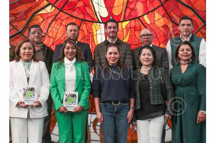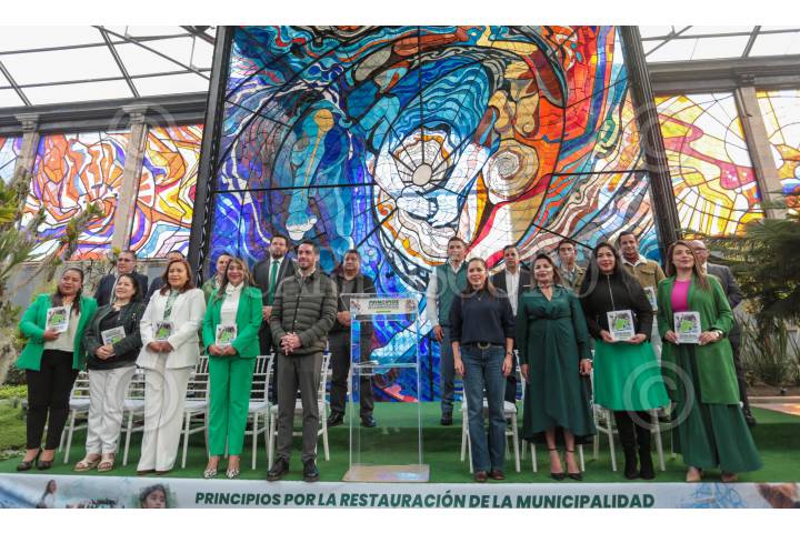 TOLUCA, ESTADO DE MÉXICO, 03FEBRERO2025.- Karen Castrejón Trujillo, dirigente nacional del Partido Verde Ecologista y José Alberto Couttolenc líder estatal del PVEM presentaron los Principios por la Restauración de la Municipalidad en el Estado de México, y estuvieron acompañados por presidentes municipales, regidores y diputados locales. FOTO: CRISANTA ESPINOSA AGUILAR /CUARTOSCURO.COM