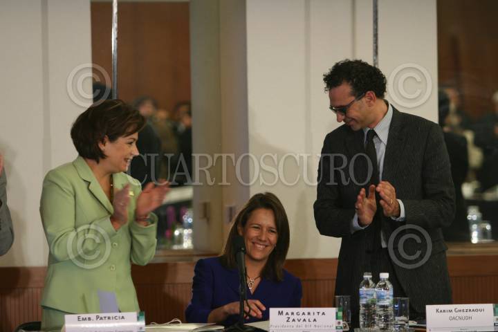MÉXICO, D.F., 30SEPTIEMBRE2008.- Patricia Espinosa, Secretaría de Relaciones Exteriores, Margarita Zavala, Primera Dama y Karim Ghezraoui, representante del Alto Comisionado para los Derechos Humanos de la ONU, durante la reunión internacional sobre la protección de los derechos niños y las niñas en el contexto de la migación internacional "Migración y Derechos Humanos de los Niños y Niñas". FOTO: MOISÉS PABLO/CUARTOSCURO.COM