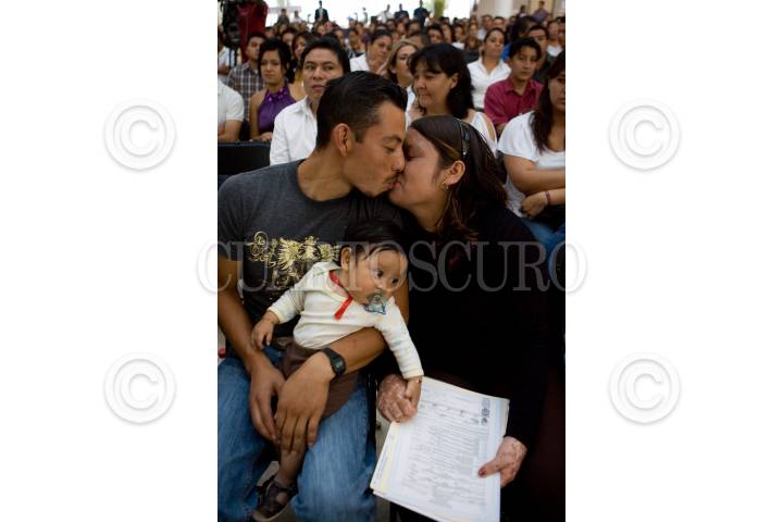 QUERETARO, QUERETARO, 12MAYO2010.- El Dif municipal a cargo de la señora Karina Castro, encabezó junto con el presidente municipal el acto "Matrimonios Colectivos" donde se desposaron mas de 500 parejas que hicieron su trámite de regularización de status matrimonial. A manera de regalo, el DIF sorteó una casa y electrodomésticos. FOTO: DEMIAN CHAVEZ/CUARTOSCURO.COM