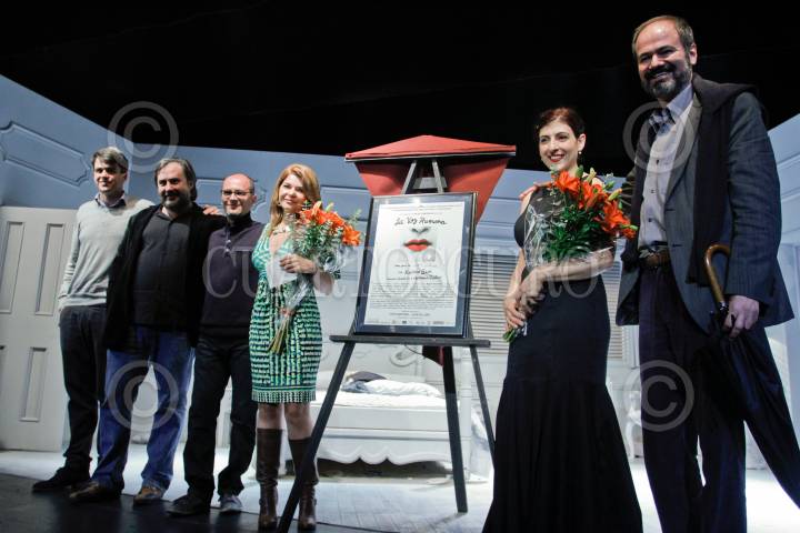 MÉXICO, D.F., 13MAYO2013.- La actriz Itati Cantoral y el escritor Juan Villoro develaron la placa por el fin de temporada de la obra teatral "La Voz Humana", protagonizada por Karina Gidi. FOTO: ISAAC ESQUIVEL /CUARTOSCURO.COM