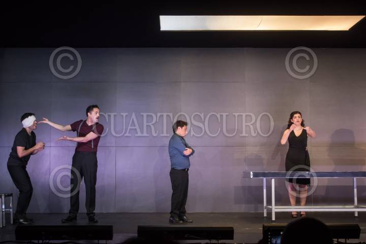 CIUDAD DE MÉXICO, 13MARZO2019.- Los actores Sergio Bonilla, Artúz Chávez, Reynaldo Rossano y Karina Gidi, durante una escena de "El Feo", obra de Marius Von Mayenburg, dirigida por Víctor Weinstock, la cual se presenta en el Teatro Milán. FOTO: ISAAC ESQUIVEL /CUARTOSCURO.COM