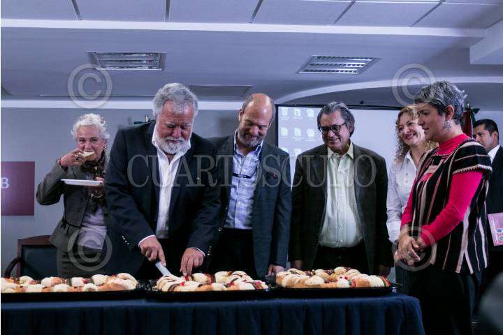 Olga Sánchez Cordero, secretaria de Gobernación, Alejandro Encinas, subsecretario de Derechos Humanos, y Karla Quintana, titular de la Comisión Nacional de Búsqueda, parten la rosca de Reyes.