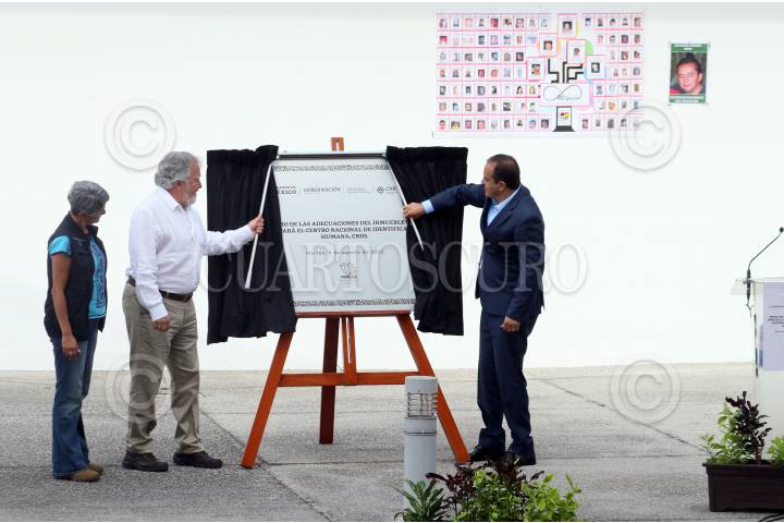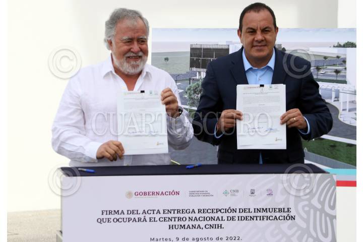 El gobernador Cuauhtémoc Blanco y el subsecretario de Derechos Humanos, Alejandro Encinas durante el inicio de las adecuaciones del inmueble que ocupará el Centro Nacional de Identificación Humana en Xochitepec, Morelos.