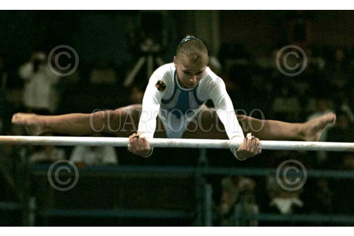 La alemana Katja Abel durante su intervención en las barras aimétricas durante la fase eliminatoria de la copa gimnástica 2000 que se celebró en el Palacio de los Deportes este domingo. FOTO: Germán Romero/CUARTOSCURO.COM