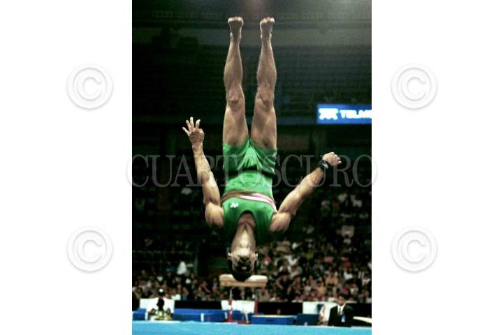 El bulgaro Jordan Jovtchev durante sus ejercicios de piso durnte las finales por aparatos de la copa gimnástica 2000. FOTO: Germán Romero/CUARTOSCURO.COM