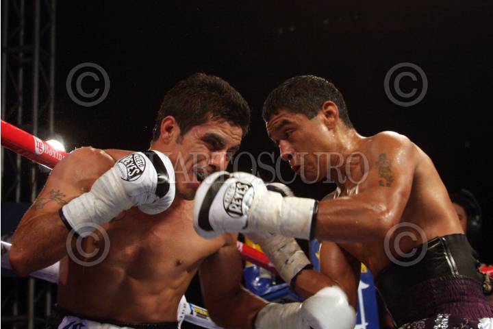MERIDA, YUCATÁN, 25FEBRERO2011.- Gilberto Keb Baas y Antonio el "Jaguar" Aguirre libraron la báscula en la ceremonia de pesaje, previa a la "Prueba de Fuego" combate en el que el yucateco defenderá por primera ocasión su centro minimosca del Consejo Mundial de Boxeo. FOTO: FRANCISCO BALDERAS/CUARTOSCURO.COM