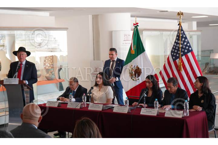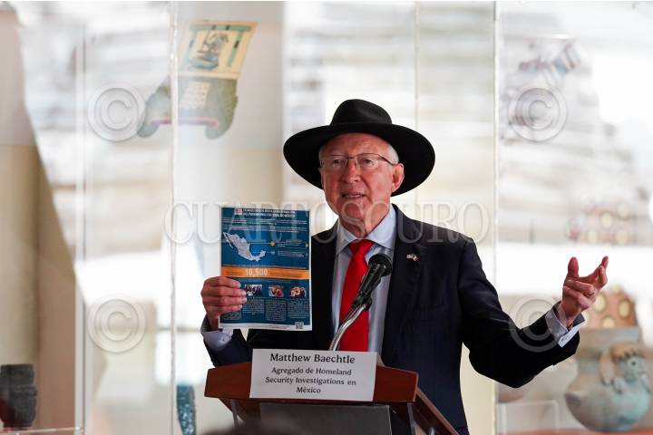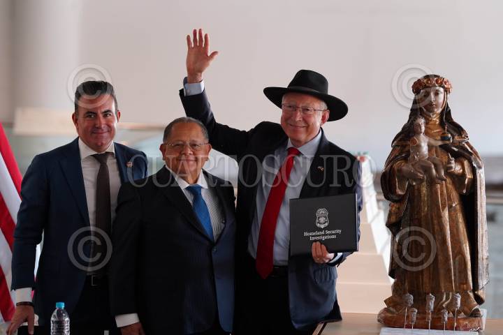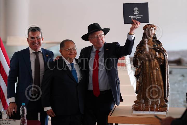 CIUDAD DE MÉXICO, 11DICIEMBRE2024.- Miguel Ángel Méndez, fiscal especial de asuntos Jurídicos e Internacionales; Ken Salazar, embajador de Estados Unidos en México, encabezaron la entrega-recepción de seis piezas arqueológicas recuperadas por decomiso y una escultura de Santa Rosa de Lima, robada de la iglesia de Epazoyucan, en Hidalgo en las inmediaciones del Museo del Templo Mayor. FOTO: GALO CAÑAS/CUARTOSCURO.COM