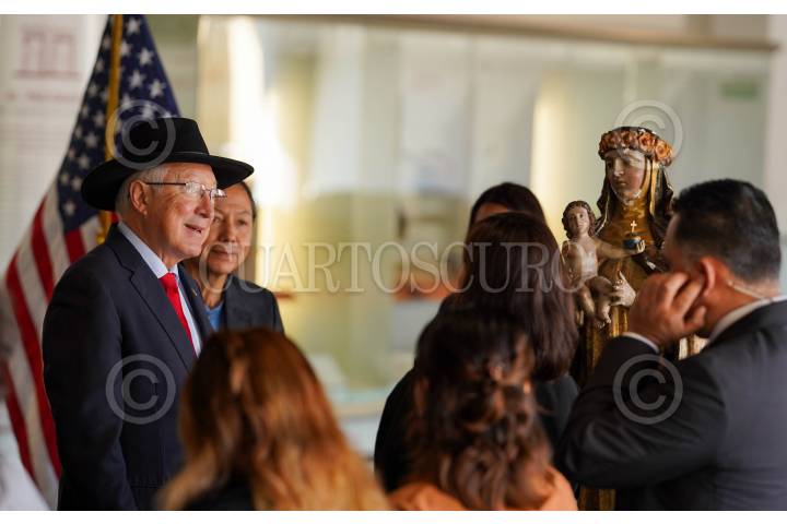 CIUDAD DE MÉXICO, 11DICIEMBRE2024.- Ken Salazar, embajador de Estados Unidos en México, encabezó la entrega-recepción de seis piezas arqueológicas recuperadas por decomiso y una escultura de Santa Rosa de Lima, robada de la iglesia de Epazoyucan, en Hidalgo en las inmediaciones del Museo del Templo Mayor. FOTO: GALO CAÑAS/CUARTOSCURO.COM