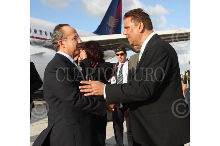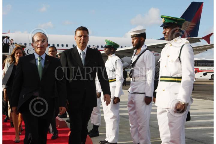 PUERTO ESPAÑA, TRINIDAD Y TOBAGO, 17ABRIL2009.- El presidente de México, Felipe Calderón Hinojosa, acompañado de el Ministro de Administración Pública, Kennedy Swaraksingh, durante su arribo a la ciudad de Puerto España, para asistir a la "5a Cumbre de las Americas". FOTO: IMPERIO RESENDIZ/CUARTOSCURO.COM